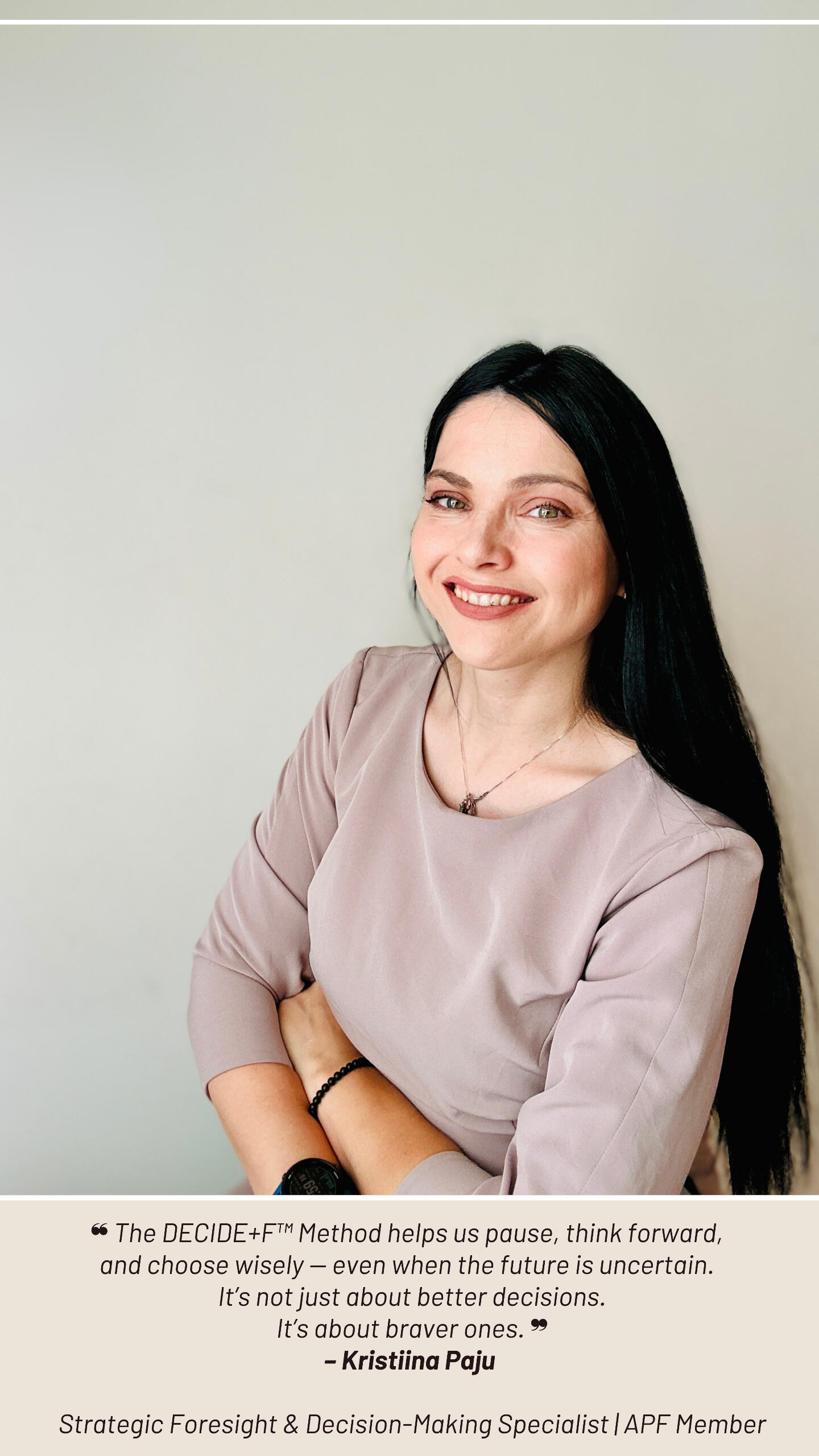 I’m a futurist, foresight facilitator, and behavioral insights advisor supporting people and organizations in making wiser, more intentional decisions. My educational journey reflects a lifelong curiosity about how we think, choose, and shape what comes next. I hold a Master of Social Sciences in Futures Studies (with a minor in Sustainable Development) from Turku School of Economics, a BBA in International Business from Turku University of Applied Sciences, and a BA in Education, with a focus on human studies and history, from Tallinn University. I’m currently completing an MBA in Behavioural Insights and Choice Architecture at Laurea University of Applied Sciences.Professionally, my path has woven through sustainable city development in the Baltic Sea region, futures work in vocational education, circular economy and innovation projects with food industry SMEs, and AI strategy development. I’ve led and co-created creative foresight initiatives, facilitated futures dialogues and workshops, and supported organizations through communication design and strategic clarity. I’ve been a member of the World Futures Studies Federation (WFSF) and am currently a member of the Association of Professional Futurists (APF).I designed the DECIDE+F™ Method to support reflective, ethical, and future-conscious thinking in a rapidly changing world.